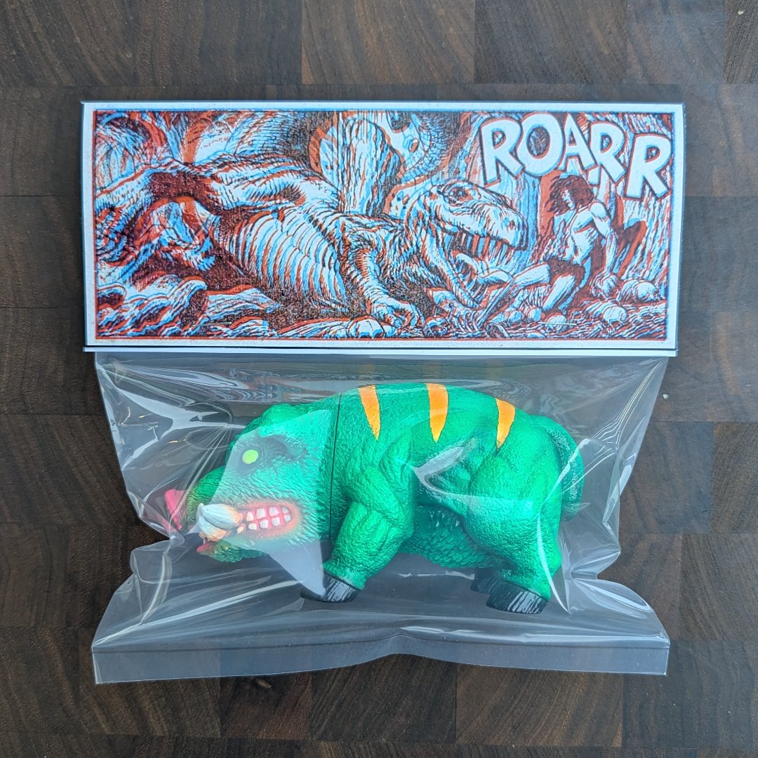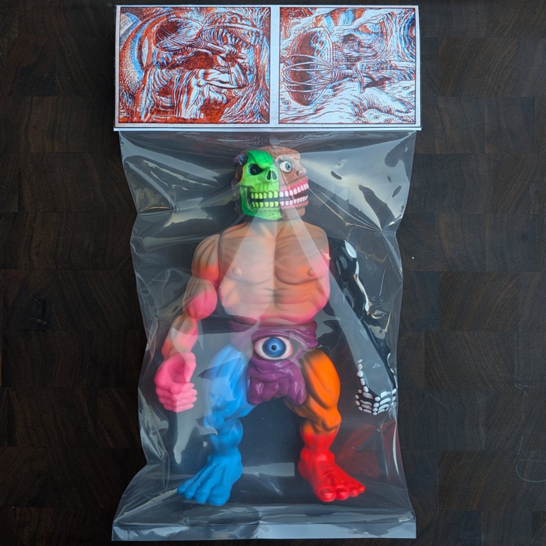 A brand new battle set for the ages! Inspired by all the classic He-Man bootleg toys from all around the world. The original vinyl body is from the toy artist Raygunwizard. The Ghoulhead and Gristle were both originally sculpted by Zectron and produced by Unbox Industries. Both figures have been beautifully painted by Ghost Gradients. Each 8 inch vinyl figure also comes with a 7 inch glow in the dark sword and 3D glasses (tucked in header) so you can enjoy the vintage 3D art on the headers. Each set is priced at $250 bucks plus shipping and supplies are very limited. Dropping right here at Noon PST. Good luck and may the power of greyskull be with you!